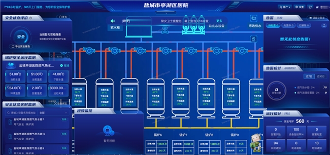 作为集医疗、教学科研、预防保健、康复于一体的二级甲等综合医院,盐城市亭湖区人民医院肩负着辐射盐城及周边区域的医疗服务重任。医院新院区配备的十台燃气真空热水锅炉,是保障诊疗秩序、病患生活的关键 “生命线”。医院人员密集、疏散难度高,对锅炉安全、用气安全、稳定运行提出极致严苛的要求,为全面筑牢安全底线,医院携手新智聚安,共同探索智能化管理解决方案。