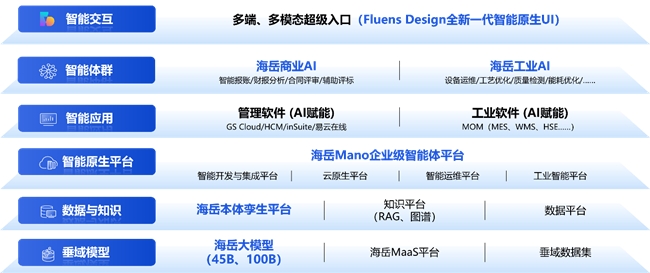 面向企业智能原生转型的核心需求,浪潮海岳全新重磅推出企业AI智能原生产品体系,基于全新一代智能原生软件架构与Fluens Design智能原生UI设计,涵盖商业AI、工业AI、Mano企业级智能体平台、本体孪生平台等核心产品,构建覆盖交互体验、平台底座、业务应用、数据知识的完整智能原生闭环,为企业释放AI价值、实现高质量数智化转型提供全新平台底座。