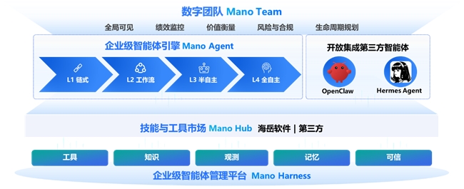 针对企业智能体落地过程中面临的治理缺失、可靠性不足、价值难以量化等关键挑战,浪潮海岳推出Mano企业级智能体平台1.0,构建集引擎、治理、生态、管理于一体的企业级智能体底座。通过企业级Harness治理框架、企业级智能体引擎、技能与工具市场助力企业打造数字团队,让智能体在企业中看得见、管得住、评得了,成为可信赖、可管理、可考核的“数字同事”。